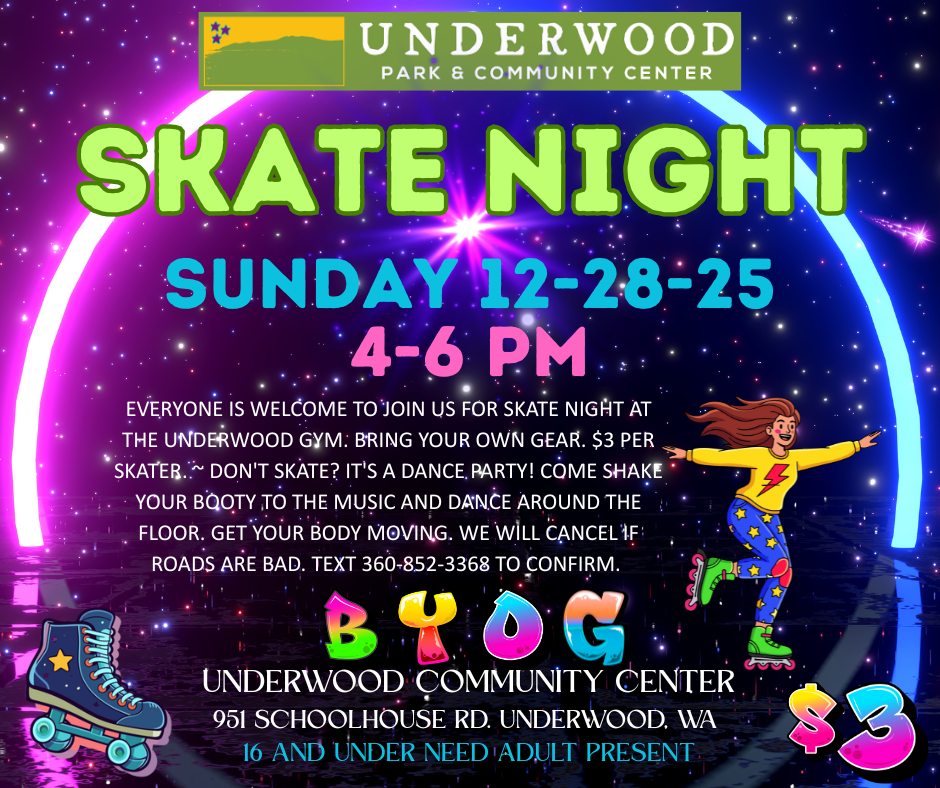 Skate Night is an all-ages event where we turn the Community Center gym into a roller rink for just one night a month. Tell your neighbors. Call your friends! Bring your own skates or rollerblades and a water bottle. We’ll provide the rest.