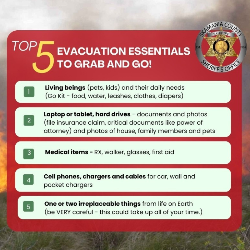 If wildfire evacuation orders are given for Underwood, notification will be sent via the Skamania County Emergency Alert system. If you have not yet registered with the county, please make it a priority to do so today! (Note: Skamania County DOES NOT send official emergency notifications via Flash Alert Messenger.)